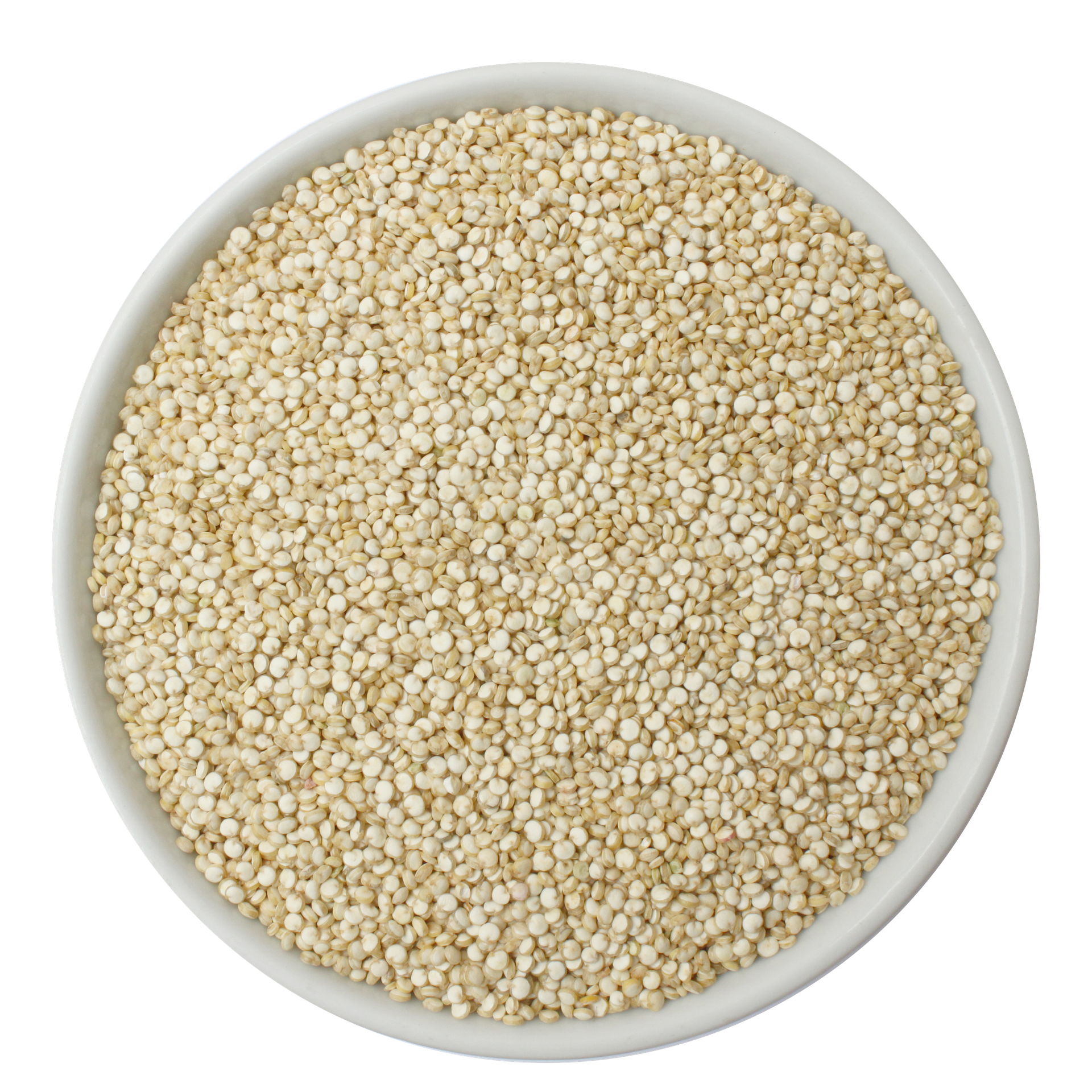 La quinoa blanca se presenta en granos pequeños y redondos, de color blanco perlado a crema claro, con una textura uniforme y limpia. Una vez cocida, los granos se tornan ligeros y esponjosos, mostrando su característico germen en forma de aro, lo que refleja su alta calidad y correcta cocción.